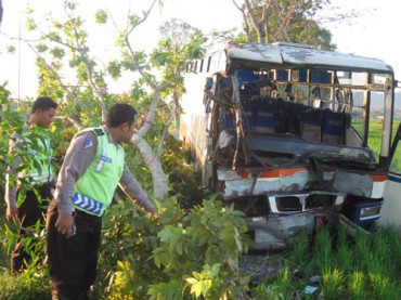 Akibat kerasnya benturan, pohon mahoni sempat bergeser sejauh lima meter. Sementara bagian kaca bus berantakan dan bagian depan bus ringsek.